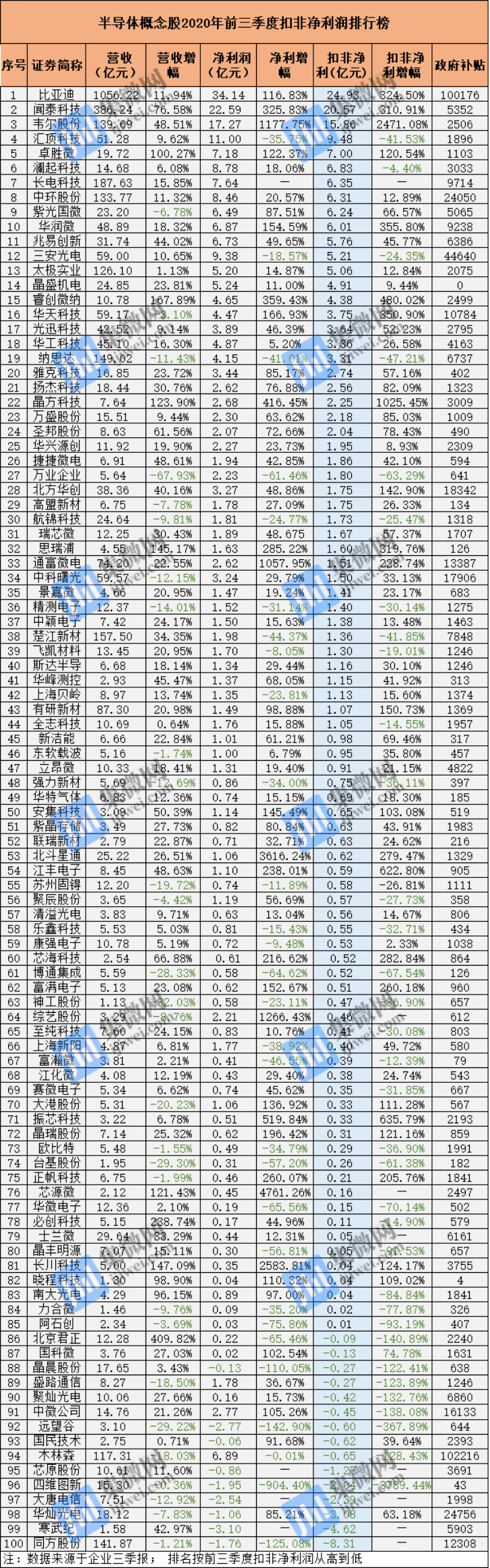 其中比亞迪、聞泰科技、韋爾股份三家公司扣非凈利潤分別為24.93億元、20.57億元、15.86億元,均超過10億元。