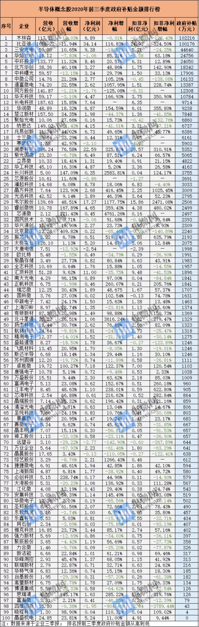據(jù)筆者統(tǒng)計,在A股100家半導(dǎo)體公司中,除了晶盛機(jī)電之外,其余99家公司2020年前三季度均獲得政府補貼,共計55.15億元,平均每家公司獲得政府補貼為5515萬元。