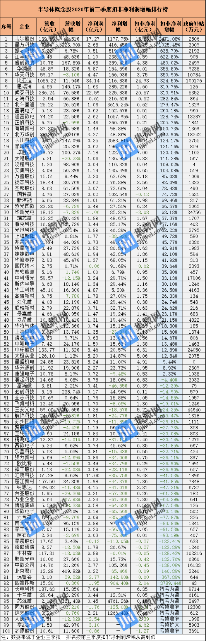 2020年前三季度A股半導(dǎo)體公司業(yè)績表現(xiàn)