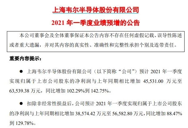 韋爾股份:2021年一季度凈利預(yù)增至少4.55億元,同比翻倍