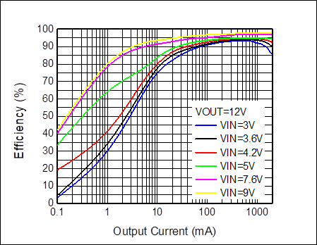 在 Vin=3.3V,Vout=9V,Iout=2A 時(shí)效率高于 90%
