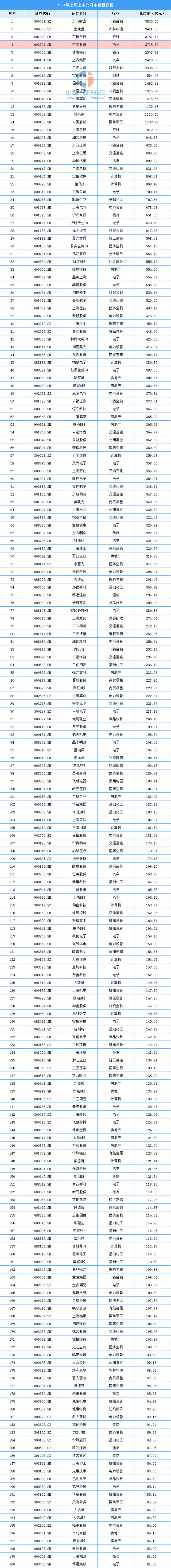 2021年上海上市公司市值排行榜