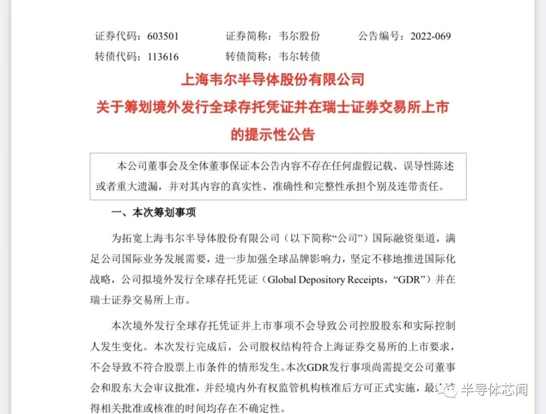 6月29日下午,中國傳感器產(chǎn)業(yè)第一企業(yè)——韋爾股份,發(fā)布公告,擬境外發(fā)行全球存托憑證(Global Depository Receipts,“GDR”)并在瑞士證券交易所上市。