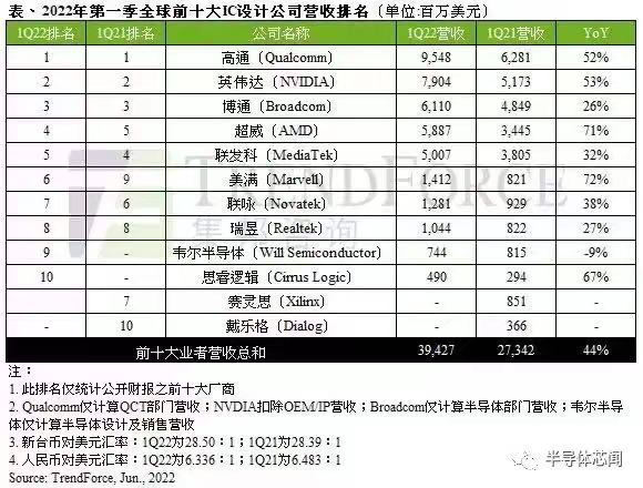 根據(jù)TrendForce 最新統(tǒng)計,全球前十大IC 設(shè)計業(yè)者2022 年第一季營收達(dá)394.3 億美元,年增44%。高通(Qualcomm)、英偉達(dá)( NVIDIA)、博通(Broadcom)蟬聯(lián)前三名,而超微(AMD)在收購賽靈思(Xilinx)完成之后,超越聯(lián)發(fā)科(MediaTek)至全球第四。