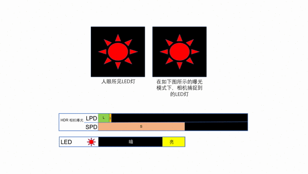 HDR 幀速和LED驅(qū)動信號是異步的(一個 LED 打開/關(guān)閉的周期為 11 毫秒;而 HDR 在日光下每幀需要 16.6 毫秒),因此 HDR 每一幀都會捕捉到 LED 打開/關(guān)閉周期間產(chǎn)生的不同的亮度,從而產(chǎn)生“閃爍”。