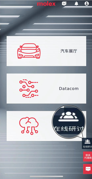 方式二:進入“Molex莫仕連接器”官方公眾號,點擊“體驗”,點擊“參觀展廳”,進入Molex虛擬展廳,注冊并登錄虛擬展廳