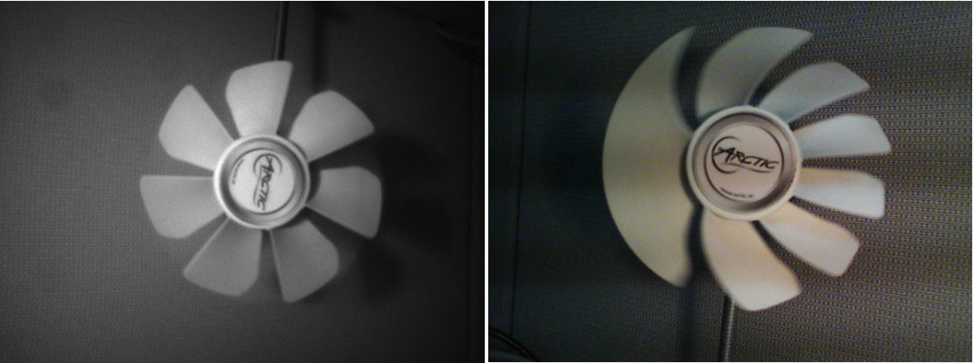 傳統(tǒng)的卷簾 (Rolling Shutter) CMOS 圖像傳感器,逐行掃描進行曝光直至所有像素被曝光,因此,不同行像素的曝光時間起始點不一樣,隨著物體高速運動,畫面產(chǎn)生失真(右圖)。