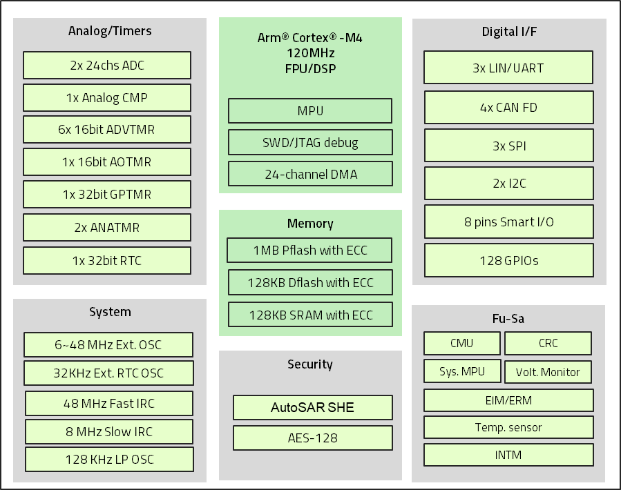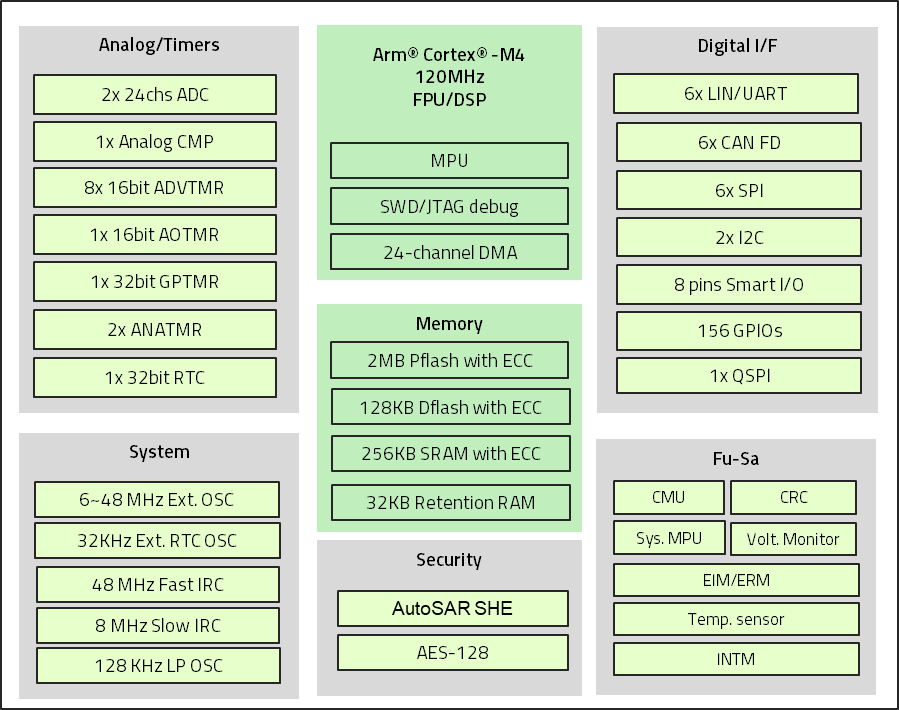 ● 4x CAN-FD, 3x LIN/UART, 3x SPI, 2x I2C