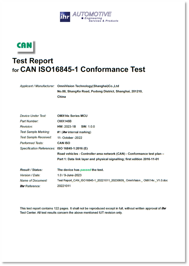 豪威CAN-FD IP已通過第三方基于ISO16845-1一致性測試,可提供測試報告及壓力測試報告。