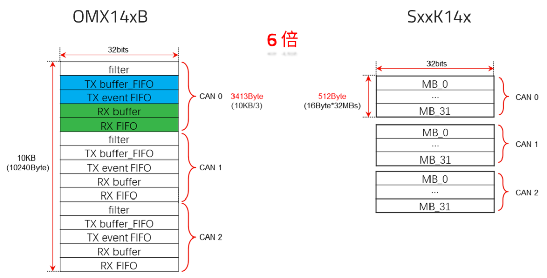 例如CAN-FD接口IP,多個CAN接口共享10KB RAM,優(yōu)化后每個CAN模塊可配置最多128個標(biāo)準(zhǔn)幀filter,最多64個擴展幀filter,最多32個TX buffer/FIFO, 最多64個RX buffer,RX FIFO0最多接收64幀報文,RX FIFO1最多接收64幀報文。