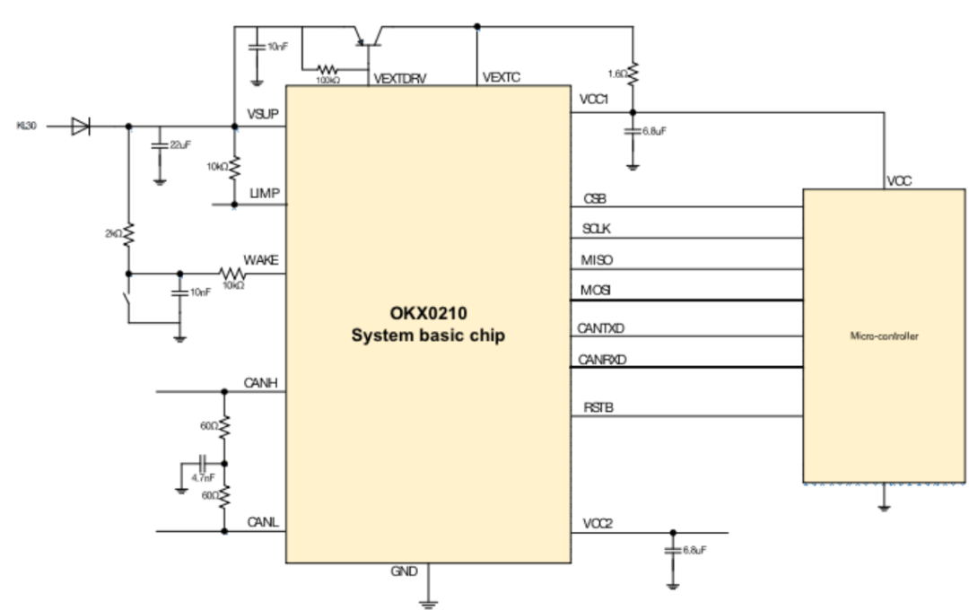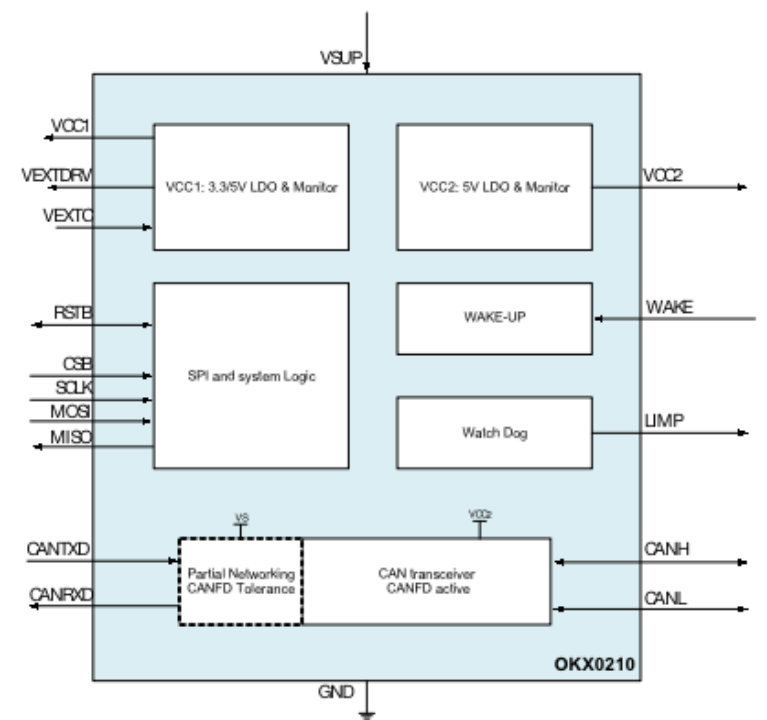 OKX0210 集成2通道LDO,1路CAN收發(fā)器,本地硬線喚醒及跛行回家模式的系統(tǒng)基礎(chǔ)芯片