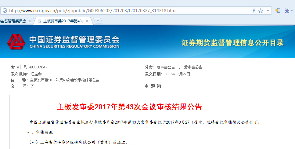 集微網(wǎng)消息, 據(jù)證監(jiān)會(huì)網(wǎng)站27日消息,上海韋爾半導(dǎo)體股份有限公司等5家公司首發(fā)申請(qǐng)過會(huì)。主板發(fā)審委2017年第43次會(huì)議審核結(jié)果公告,中國證券監(jiān)督管理委員會(huì)主板發(fā)行審核委員會(huì)2017年第43次發(fā)審委會(huì)議于2017年3月27日召開,上海韋爾半導(dǎo)體股份有限公司(首發(fā))獲通過。