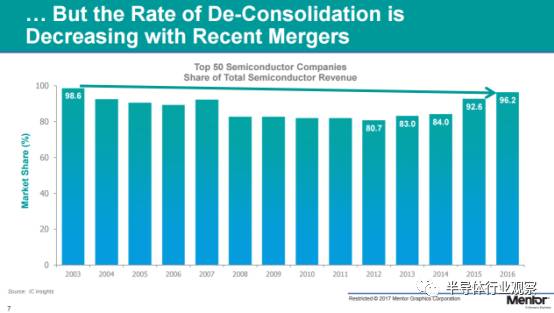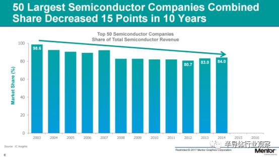 而且,雖然2015年,2016年并購(gòu)的數(shù)量很多,總量很大,也并不意味著全球半導(dǎo)體企業(yè)最后會(huì)合并成一家公司,根據(jù)Rhines 分享的數(shù)據(jù)顯示,截至2014年,在過(guò)去的十年當(dāng)中,全球前50的半導(dǎo)體公司所占有的市場(chǎng)份額下降了15%,僅為84%。