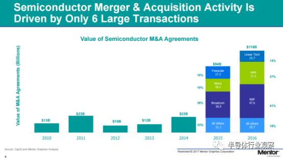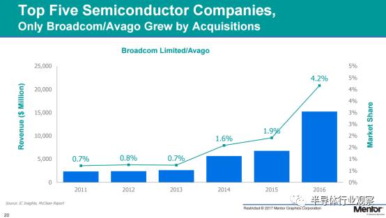 不過(guò),Rhines 也指出,這其中也有一個(gè)特例,那就是博通(Broadcom)和安華高(Avago)的合并,大幅度刺激了該公司的營(yíng)收。
