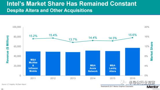 縱觀半導(dǎo)體行業(yè)的整個(gè)發(fā)展歷史,從1972年至2016年,全球第一的半導(dǎo)體公司的市場(chǎng)份額始終維持在一個(gè)相對(duì)穩(wěn)定的區(qū)間內(nèi),全球前五大半導(dǎo)體公司的總市場(chǎng)份額更是如此,在過(guò)去的四十五年中僅增長(zhǎng)了6%,甚至都沒(méi)有超過(guò)50%。所謂“一統(tǒng)天下”的言論,這樣看來(lái)確實(shí)有些過(guò)分的理想化了。