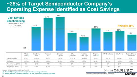 從過(guò)去半導(dǎo)體行業(yè)的眾多整合并購(gòu)案例的公開(kāi)數(shù)據(jù)來(lái)看,大約目標(biāo)經(jīng)營(yíng)費(fèi)用(OpEx)的25%被認(rèn)定為節(jié)省成本。 綜合Intel收購(gòu)Altera、Avago并購(gòu)Broadcom、NXP并購(gòu)Freescale等大宗M&A案例來(lái)看,成本縮減的比例被鉚定在LTM OpEx 25%左右的水平。