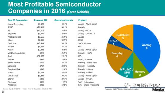 顯然不是。Rhines 也對(duì)業(yè)內(nèi)“規(guī)模越大,公司收益越大”的傳統(tǒng)觀點(diǎn)提出了質(zhì)疑。根據(jù)最近五年的數(shù)據(jù)來(lái)看,那些規(guī)模越大的企業(yè),反而并不是最能夠獲利的企業(yè),公司規(guī)模和盈利能力之間并無(wú)強(qiáng)相關(guān)性。例如,在2016年最賺錢的20家公司當(dāng)中,Intel就沒(méi)有l(wèi)inear利潤(rùn)率高。并且,在全球200M美金市值以上,最盈利的20家公司中,包括了模擬、存儲(chǔ)、MPU/MCU/GPU、Foundry、FPGA和SoC/ASIC,可謂遍地開(kāi)花,各種應(yīng)用領(lǐng)域都有。