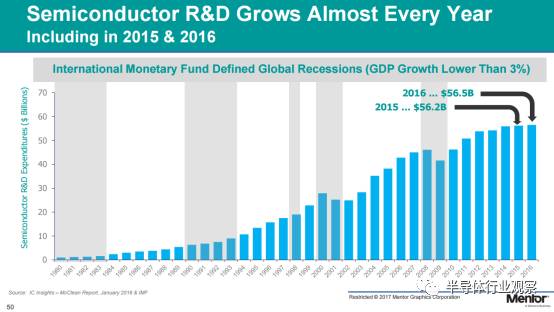 那么事實(shí)是怎樣的呢?從1980年開(kāi)始,直到今天,包括大規(guī)模M&A頻發(fā)的2015年和2016年,總研發(fā)費(fèi)用實(shí)際上幾乎一直在保持增長(zhǎng)。除了在2009年的全球金融危機(jī)影響下的半導(dǎo)體產(chǎn)業(yè)的短期衰退中,研發(fā)費(fèi)用出現(xiàn)了一個(gè)小的波谷,很快又從2010年起恢復(fù)了增長(zhǎng)態(tài)勢(shì),2015年和2016年分別達(dá)到了562億美金和565億美金。