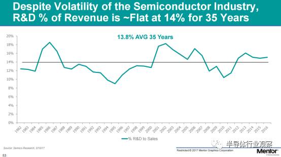 縱觀從1982年到2016年的研發(fā)費(fèi)用占總銷售額的比例數(shù)據(jù)(考慮到國(guó)際貨幣基金組織確定的全球經(jīng)濟(jì)衰退,GDP增長(zhǎng)低于3%),無(wú)論半導(dǎo)體行業(yè)的整體業(yè)態(tài)在其間如何起伏,35年來(lái),R&D開(kāi)支占總銷售額的百分比是一條非常平坦的曲線,約為14%,這也可以作為絕大多數(shù)半導(dǎo)體公司維持、存續(xù)自己業(yè)務(wù)的一個(gè)大致考量。