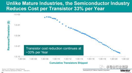 再聚焦到單晶體管成本的變化曲線,我們能夠更清晰地看到半導(dǎo)體產(chǎn)業(yè)與鋼鐵、采礦、制藥等成熟產(chǎn)業(yè)之間的巨大差別。單晶體管成本每年縮減約33%,事實(shí)上,這也是半導(dǎo)體產(chǎn)業(yè)仍在蓬勃發(fā)展,并不斷驅(qū)動(dòng)基礎(chǔ)科技進(jìn)步的有力證明。
