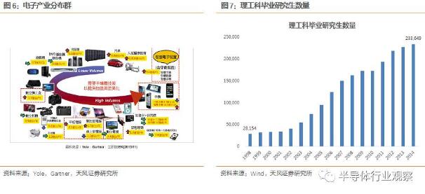 中國(guó)大陸電子產(chǎn)業(yè)集聚效應(yīng)催生上游半導(dǎo)體供應(yīng)鏈本土化需求,以及工程師紅利是大環(huán)境邊際改善。中國(guó)電子產(chǎn)業(yè)在全球的地位已經(jīng)得到快速的提升,進(jìn)入主流產(chǎn)品如蘋果供應(yīng)鏈的企業(yè)數(shù)量不斷增多。現(xiàn)在已經(jīng)形成了一個(gè)非常齊備的終端電子產(chǎn)品的生態(tài),并且從出口導(dǎo)向型市場(chǎng)轉(zhuǎn)變?yōu)橄M(fèi)型主導(dǎo)市場(chǎng),下游終端產(chǎn)品對(duì)上游半導(dǎo)體行業(yè)供應(yīng)鏈本地化需求強(qiáng)烈。就產(chǎn)業(yè)環(huán)境而言,中國(guó)還有一個(gè)優(yōu)勢(shì)在于工程師紅利。過去20 多年,中國(guó)培育了大量高等工科教育畢業(yè)生,中國(guó)每年培養(yǎng)的工程師的數(shù)量,相當(dāng)于美國(guó)、歐洲、日本和印度培養(yǎng)出來的工程師的總數(shù),工程師紅利明顯。