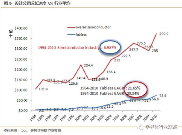 統(tǒng)計(jì)設(shè)計(jì)公司的增速明顯優(yōu)于整體行業(yè)增速。處于行業(yè)上游位置具有高壁壘和行業(yè)敏感性,主動(dòng)尋求未來應(yīng)用判斷走勢(shì),正確的實(shí)現(xiàn)路徑將迅速擴(kuò)大企業(yè)規(guī)模和增長(zhǎng)。歷史證明設(shè)計(jì)公司的成長(zhǎng)速率遠(yuǎn)高于行業(yè)平均水準(zhǔn)。