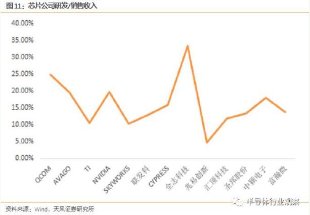 選取美股各個(gè)領(lǐng)域的龍頭公司和A股設(shè)計(jì)公司的研發(fā)占比情況,發(fā)現(xiàn)中國(guó)公司的研發(fā)占銷售占比和美國(guó)公司相差不大,甚至像全志科技還遙遙領(lǐng)先。