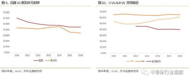 模擬芯片市場(chǎng),主要玩家TI和ADI長(zhǎng)期享受高毛利紅利,產(chǎn)業(yè)格局尚未發(fā)生質(zhì)變。但以數(shù)字芯片歷程推導(dǎo),在通用市場(chǎng)新進(jìn)入者憑借低毛利改變市場(chǎng)格局,獲得市值成長(zhǎng)的邏輯可以順推。