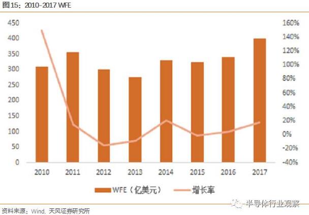 美股重要的設(shè)備公司AMAT上調(diào)了2017年WFE(Wafer Fabrication Equipment)投資的預(yù)期,從2017年初5%全年增長(zhǎng)上調(diào)至15%,上調(diào)增長(zhǎng)再次驗(yàn)證今明兩年是半導(dǎo)體設(shè)備大年周期的開啟。同時(shí)預(yù)期WFE在今明兩年將迅速達(dá)到400億美元。已經(jīng)給出2017-2018半導(dǎo)體景氣度上行的判斷,同時(shí)我們也看到半導(dǎo)體景氣度的上升帶來對(duì)半導(dǎo)體設(shè)備的需求,全球WFE也在2010年之后再次達(dá)到了同比增速的高點(diǎn)。