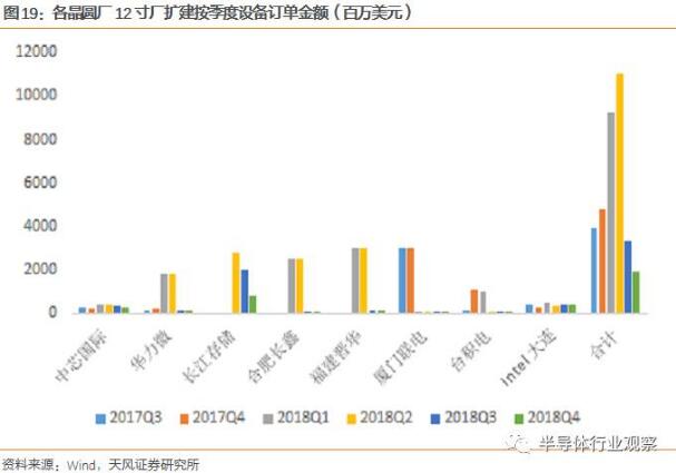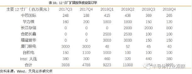 判斷中國(guó)大陸地區(qū)對(duì)于設(shè)備采購需求的邊際改善2017 3Q開始,在2018H1達(dá)到巔峰。對(duì)于投資而言,關(guān)注的是訂單增量,我們分析國(guó)內(nèi)晶圓廠產(chǎn)線建設(shè)帶來的對(duì)設(shè)備采購的邊際增量。設(shè)備采購周期開啟從2018Q1開始見到累積的訂單驅(qū)動(dòng)。