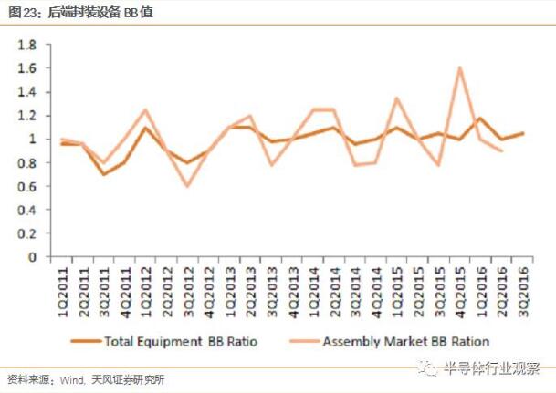 自上而下來看,觀察封測(cè)設(shè)備的BB值對(duì)于A股有更多的指導(dǎo)意義,我們觀察封測(cè)設(shè)備BB值判斷國(guó)內(nèi)的封測(cè)企業(yè)將迎來景氣上揚(yáng)階段。作為國(guó)內(nèi)半導(dǎo)體產(chǎn)業(yè)鏈里最具有確定性業(yè)績(jī)兌現(xiàn)的板塊,相較于前端設(shè)備的BB值,封測(cè)行業(yè)設(shè)備BB值顯示出更強(qiáng)的周期性,而且周期以一年為期。從周期角度看,Q3Q4通常為半導(dǎo)體封測(cè)行業(yè)開工率較高的時(shí)期,而設(shè)備訂購的leadtime以半年為期,因此封測(cè)行業(yè)的BB值在Q1會(huì)向上揚(yáng)。我們通??梢酝ㄟ^Q1的封測(cè)行業(yè)設(shè)備BB值來判斷半年后的封測(cè)景氣度。2017年前兩個(gè)月的封測(cè)設(shè)備BB值在1.49左右,預(yù)示今年2H封測(cè)行業(yè)的需求拉動(dòng)產(chǎn)能填滿可以高看一線。