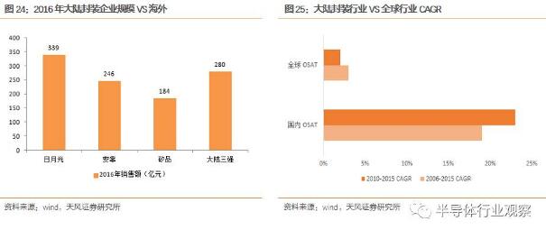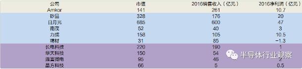 封裝本質(zhì)上是集成電路產(chǎn)業(yè)鏈中賺錢最難的行業(yè),需要通過不斷加大投資來賺取每一塊錢上的邊際增量。國(guó)內(nèi)封測(cè)三強(qiáng)(長(zhǎng)電科技、華天科技、通富微電)的銷售額在2016年合計(jì)達(dá)到280億(長(zhǎng)電科技180億,華天科技50億,通富微電49億),同時(shí)期日月光的銷售額約合人民幣339億人民幣(日月光的封裝業(yè)務(wù)部分),矽品的銷售額184億人民幣,安靠的銷售額246億人民幣。我們認(rèn)為,經(jīng)過這些年的發(fā)展,中國(guó)大陸的封測(cè)行業(yè)率先躋身全球集成電路產(chǎn)業(yè)鏈分工,充分享受全球半導(dǎo)體行業(yè)增長(zhǎng)帶來的行業(yè)紅利。我們也可以看到,大陸封裝企業(yè)依托下游市場(chǎng)的帶動(dòng),在增速方面會(huì)顯著優(yōu)于海內(nèi)外同類企業(yè)。