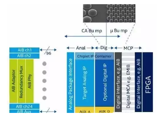 在Hot Chips大會(huì)上,英特爾介紹了兩種采用EMIB技術(shù)的介面,其一名為UIB,是以一種若非Samsung就是SK Hynix使用的DRAM堆疊Jedec連結(jié)標(biāo)準(zhǔn)為基礎(chǔ);另外一個(gè)稱作AIB,是英特爾為收發(fā)器開發(fā)的專有介面,之后廣泛應(yīng)用于類比、RF與其他元件。