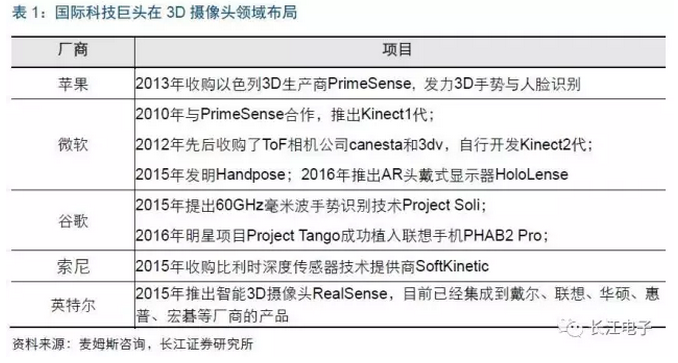最早涉足3D攝像頭研發(fā)的公司是微軟,2006年微軟與CVI開始一起研發(fā)紅外投影式多點(diǎn)觸控桌面電腦,自此打開了通往3D感應(yīng)和多點(diǎn)觸控領(lǐng)域的大門。2010年微軟與以色列3D生產(chǎn)商PrimeSense合作研發(fā)并推出XBOX360體感周邊外設(shè)——Kinect1代,該款產(chǎn)品將人機(jī)交互的理念融合到游戲中,上市僅60天銷量高達(dá)800萬臺,成功獲得“吉尼斯世界紀(jì)錄中銷售速度最快消費(fèi)者設(shè)備”的頭銜。3D視覺市場廣闊的發(fā)展前景開始吸引包括蘋果、谷歌、英特爾等在內(nèi)的國際科技巨頭紛紛布局該領(lǐng)域。