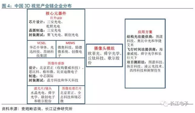 目前我國3D視覺產(chǎn)業(yè)鏈的雛形已經(jīng)基本形成,上游主要是核心元器件的研發(fā)與制造,具體包括紅外LED芯片企業(yè)三安光電、乾照光電,VCSEL提供商華芯半導(dǎo)體、光迅科技,封裝測試商晶方科技和華天科技等;中游指的是攝像頭模組制造,歐菲光、舜宇光學(xué)、丘鈦科技等企業(yè)在該領(lǐng)域具有明顯優(yōu)勢;下游應(yīng)用方案提供商根據(jù)不同的3D成像技術(shù)分為三種,其中結(jié)構(gòu)光提供商包括奧比中光、華捷艾米等,TOF提供商包括??低暋⑺从罟鈱W(xué)等,雙目測距法提供商包括圖漾科技、縱目科技、凌云光技術(shù)等。