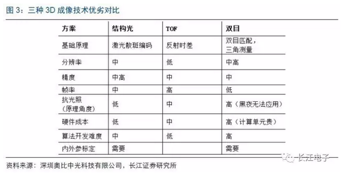 三種技術(shù)在分辨率、精度、硬件成本等方面各有優(yōu)劣,目前結(jié)構(gòu)光技術(shù)較為成熟,微軟Kinect1代與英特爾RealSense前置3D攝像頭均采用這種方案。由于蘋果2013年收購以色列3D生產(chǎn)商PrimeSense,因此預(yù)測即將問世的iPhone 8也很有可能采用該生產(chǎn)商提供的結(jié)構(gòu)光方案。
