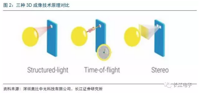 采用結(jié)構(gòu)光的3D攝像頭工作原理是攝像頭將呈現(xiàn)散斑或者點(diǎn)陣的激光紅外線圖案發(fā)射到物體表面,被測物體接觸到光信息后將圖案反射給攝像頭,攝像頭將反射回來的圖案大小與原圖案進(jìn)行對比,進(jìn)而測算出被測物體位置與深度等信息。采用飛行時間法的工作原理是攝像頭向被測物體發(fā)射光脈沖后被反射回來,接收器根據(jù)光從發(fā)射到接收的時間來判斷物體的位置。雙目測距法是指采用兩個或兩個以上攝像頭同時對被測物體采集圖像信息,然后根據(jù)三角成像原理計(jì)算物體距離。