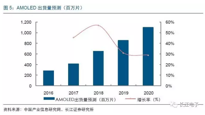 2015年5月京東方第6代成都LTPS/AMOLED生產(chǎn)線一期項(xiàng)目在成都高新區(qū)西部園區(qū)正式開工建設(shè),一期投資220億元。2016年2月,第6代LTPS/AMOLED生產(chǎn)線二期項(xiàng)目簽約儀式在成都高新區(qū)舉行,投資額在一期220億元的基礎(chǔ)上增加245億元,兩期總計(jì)465億元,并成為中國首條AMOLED生產(chǎn)線。2016年10月,京東方綿陽第6代AMOLED(柔性)生產(chǎn)線項(xiàng)目在四川綿陽正式簽約,計(jì)劃總投資465億元,產(chǎn)能為每月4.8萬片玻璃基板,預(yù)計(jì)2019年實(shí)現(xiàn)量產(chǎn)。此外,深天馬大力建設(shè)AMOLED面板生產(chǎn)線,強(qiáng)化中小尺寸地位;華星光電開建AMOLED產(chǎn)線,2019年Q2投產(chǎn)。隨著京東方、深天馬等OLED面板產(chǎn)能逐漸釋放,三星在該領(lǐng)域的壟斷態(tài)勢將逐漸被打破,OLED滲透率也會大幅提升。