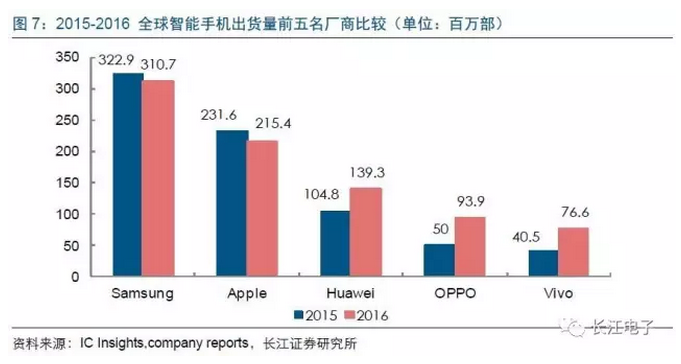 由上圖可以看到,2015-2016年全球智能手機(jī)出貨量前五名廠商排名結(jié)構(gòu)未發(fā)生變化,三星與蘋果出貨量分別下降4%與7%,國產(chǎn)品牌華為、OPPO與Vivo分別實(shí)現(xiàn)33%、88%與89%的高速增長。但從數(shù)量上看,三星與蘋果出貨量依然大幅度領(lǐng)先于其他手機(jī)生產(chǎn)商。蘋果與三星在智能手機(jī)領(lǐng)域的風(fēng)向標(biāo)地位與示范作用短期內(nèi)難以被超越,近兩年兩家廠商不僅陸續(xù)推出搭配OLED屏幕的智能手機(jī),還提高了對該領(lǐng)域的研發(fā)與生產(chǎn)力度,這將引起其他智能手機(jī)生產(chǎn)商對OLED屏幕的重視與跟進(jìn)。未來隨著OLED屏幕滲透率不斷提高,我國國內(nèi)在激光切割與異形切割、檢測設(shè)備制造等領(lǐng)域占有一席之地的大族激光與精測電子將會迎來新一輪增長點(diǎn)。