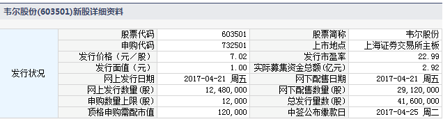 韋爾股份4月21日發(fā)行 申購上限1.2萬股
