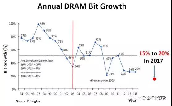 據(jù)美光(Micron)表示,2017年DRAM供給位元預(yù)計成長15-20%,可說是近20年來最低的位元成長率(bit growth)。較低的位元成長率,主要源于DRAM微縮限制。市場上有好一段時間都沒有任何有關(guān)DRAM微縮的消息了。當(dāng)供給位元成長低于45%時,這就是一個賣方的市場了。因此,DRAM的寡頭壟斷、低位元成長率,以及制造擴(kuò)張遲緩,導(dǎo)致長期的供應(yīng)吃緊。最終,可能只是DRAM的價格持續(xù)增加,而供應(yīng)面卻不會有任何改善。