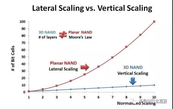 許多分析師預(yù)計,大約在2018年底,當(dāng)64層和96層3D NAND快閃存儲器的制造趨于成熟時,市場供應(yīng)吃緊的情況將會緩解。因此,明年將會有足夠的NAND供應(yīng)嗎?如圖所示,平面NAND的橫向微縮(即摩爾定律)以2的N次冪方式呈指數(shù)級增加位元單元。相對地,3D NAND的單元層數(shù)(即垂直微縮)則線性增加位元單元。目前,根據(jù)摩爾定律,平面NAND符合位元單元的指數(shù)級需求成長。然而,平面NAND面對微縮限制,3D NAND僅以線性位元成長率,將難以達(dá)到市場的需求。