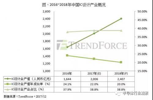 最新研究報告指出,2017年中國IC設計業(yè)產值預估為達人民幣2006億元,年增率為22%,預估2018年產值有望突破人民幣2400億元,維持約20%的年增速。