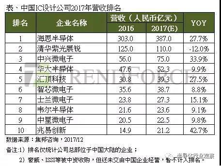從個別IC設計公司2017年營收表現(xiàn)來看,海思受惠于母公司華為手機出貨的強勢增長,以及麒麟芯片搭載率的提升,2017年營收維持25%以上的年增率。