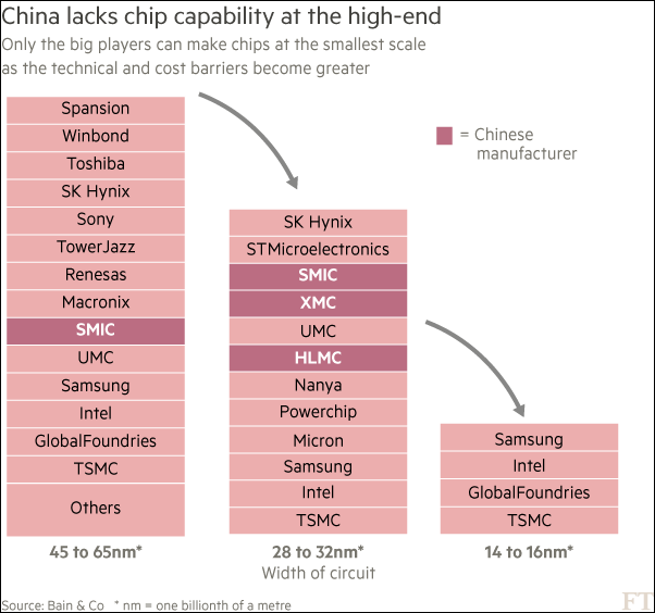 世界芯片制造商的晶體管制成精度,精度越高性能越好,目前能夠商業(yè)化的最好精度是14-16納米芯片。圖中紅色為中國公司