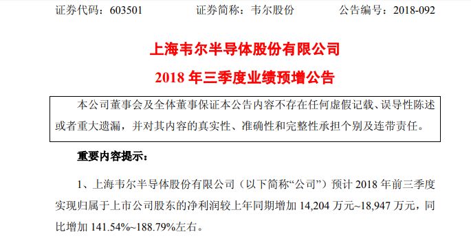 昨日晚間,韋爾股份發(fā)布了一則2018年三季度業(yè)績(jī)預(yù)增公告,公告內(nèi)容顯示,韋爾股份預(yù)計(jì)2018年前三季度實(shí)現(xiàn)歸屬上市公司股東的凈利潤(rùn)較上年同期增加1.42億元—1.89億元,同比增加141.54%—188.79%左右。