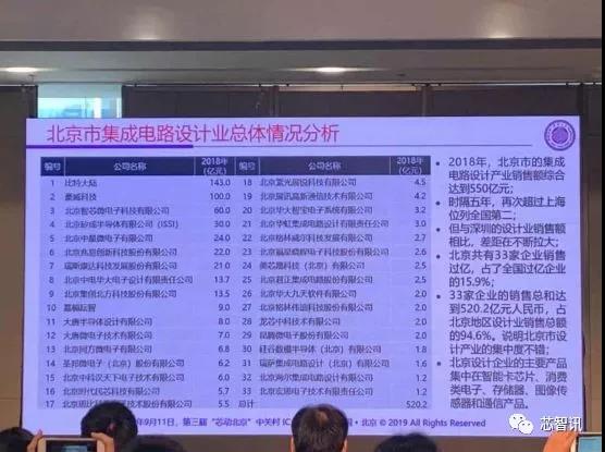 這里需要指出但是,上圖中,魏少軍教授將比特大陸作為北京集成電路設(shè)計(jì)企業(yè),并且統(tǒng)計(jì)其貢獻(xiàn)的營收為143億元。這里可能指的是比特大陸2018年在北京所貢獻(xiàn)的營收。如果指的是比特大陸的芯片設(shè)計(jì)的收入,那么143億的這個數(shù)據(jù)卻并未出現(xiàn)在魏少軍教授公布的2018年國內(nèi)十大芯片設(shè)計(jì)廠商的榜單當(dāng)中。
