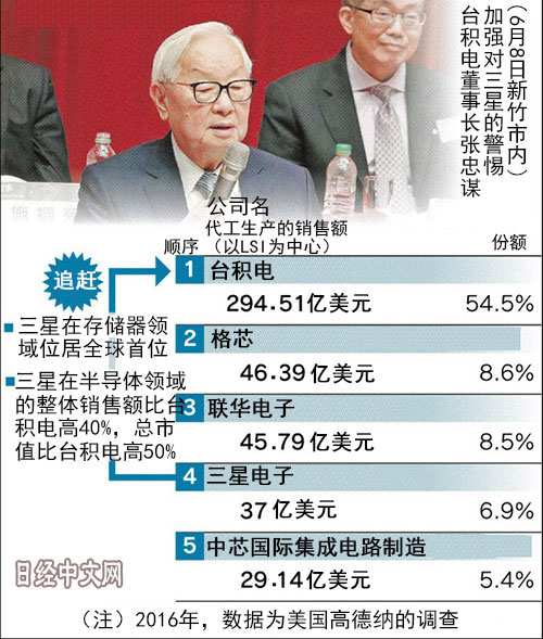 在以大規(guī)模集成電路為中心的半導(dǎo)體代工生產(chǎn)領(lǐng)域,臺(tái)積電在全球的市場(chǎng)份額超過(guò)50%,股票總市值達(dá)到20多萬(wàn)億日元,超過(guò)了半導(dǎo)體銷(xiāo)售額全球居首的美國(guó)英特爾(總市值接近19萬(wàn)億日元)。在臺(tái)積電創(chuàng)始人張忠謀眼里,三星是一個(gè)非常強(qiáng)大的對(duì)手。