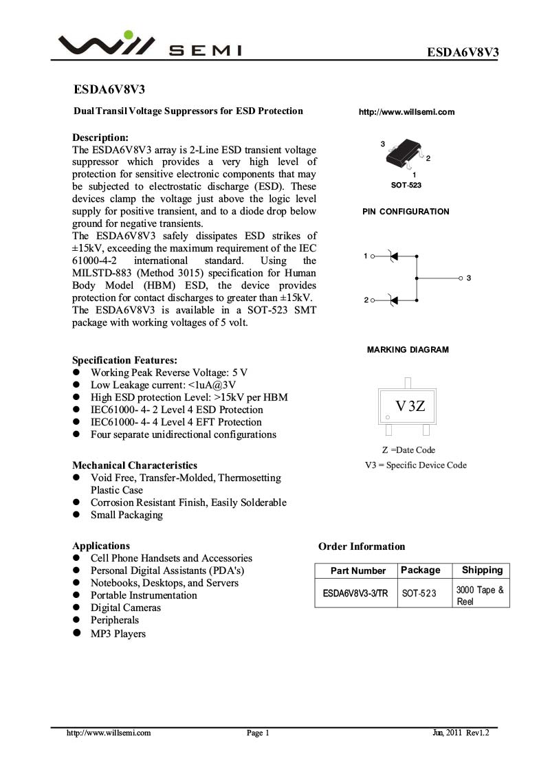 首頁 - 產(chǎn)品中心 - 代理產(chǎn)品 - 韋爾 / WILL -ESDA6V8V3 韋爾小功率靜電TVS