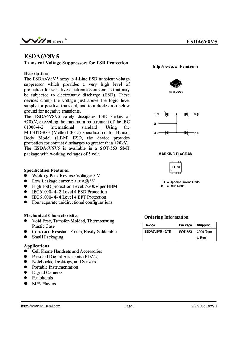 首頁 - 產(chǎn)品中心 - 代理產(chǎn)品 - 韋爾 / WILL -ESDA6V8V5 韋爾小功率靜電TVS